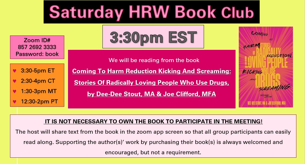 We are reading the book, Coming To Harm Reductio Kicking and Screaming, Stories of Radically Loving People Who Use Drugs, by Dee-Dee Stout and Joe Clifford.