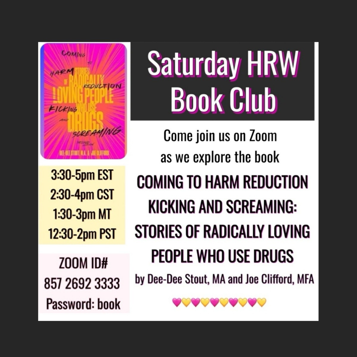 We are reading the book Coming To Harm Reduction Kicking and Screaming: Stories of Radically Loving People Who Use Drugs, by Dee-Dee Stout, MA and Joe Clifford, MFA